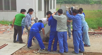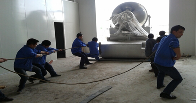 午飯后,大家顧不上休息。來(lái)自各個(gè)部門(mén)的十五六名青壯年,聚集在設(shè)備安裝現(xiàn)場(chǎng)。在郝康廠長(zhǎng)的帶領(lǐng)和指揮下,所有人一共分為三個(gè)小組。第一個(gè)小組負(fù)責(zé)在混合機(jī)下面鋪設(shè)鋼管,使二維混合機(jī)能始終在鋼管上滾動(dòng)。第二個(gè)小組在后面,負(fù)責(zé)推、撬動(dòng)混合機(jī)。第三個(gè)小組則在前面依靠纜繩使勁地拉動(dòng)混合機(jī)。在“一、二、三”的吶喊聲中,大家配合的很默契,二維混合機(jī)也朝著預(yù)定的方向蠕動(dòng)著。一兩個(gè)小時(shí)過(guò)去了,大家的聲音變得嘶啞了,衣服也都被汗水浸透了。值得欣慰的是,二維混合機(jī)最后以“倒車(chē)入庫(kù)”的方式準(zhǔn)確、安全地定位了。