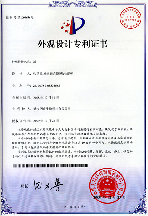 外觀設(shè)計(jì)專利證書(shū)(罐專利)